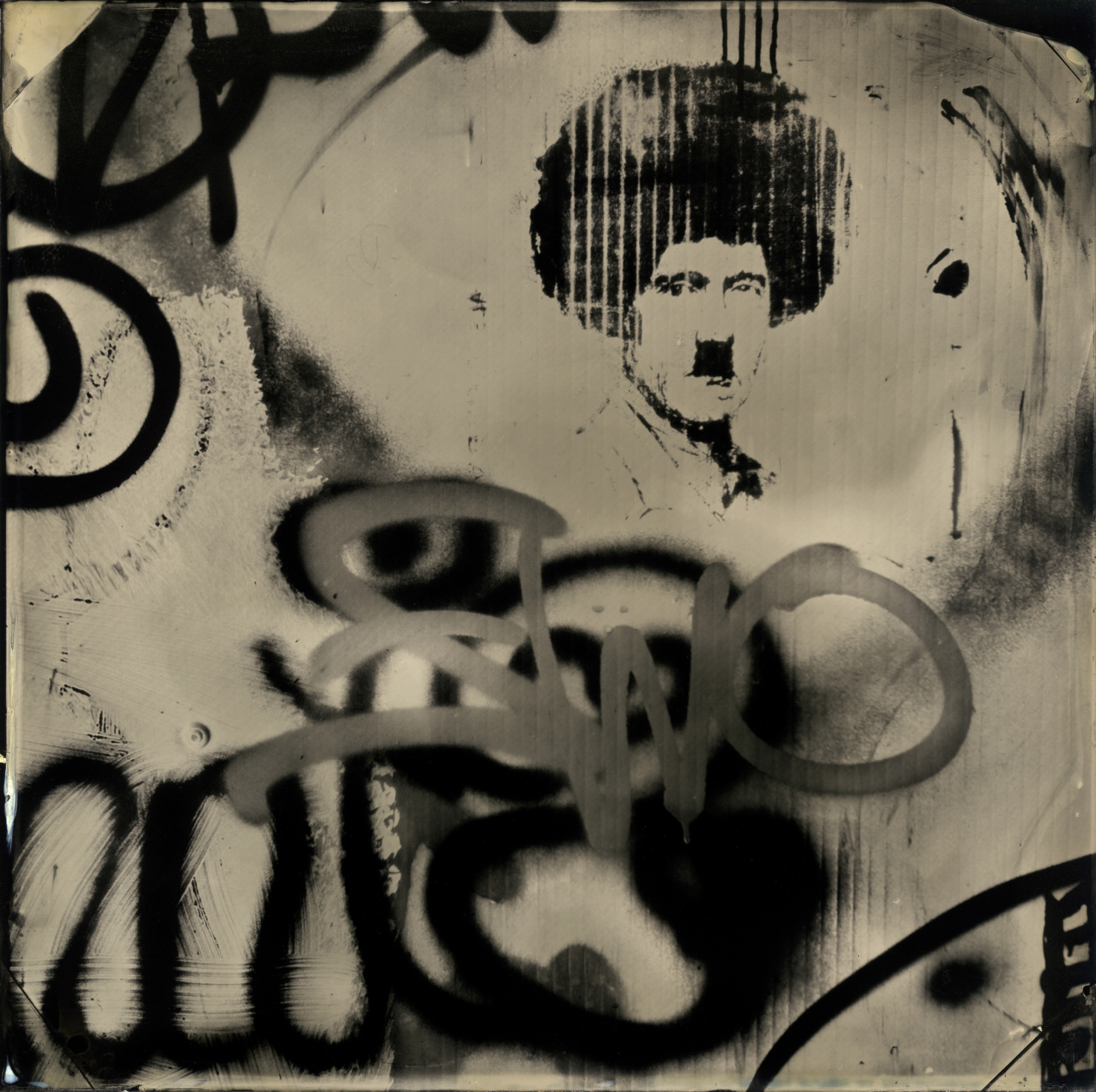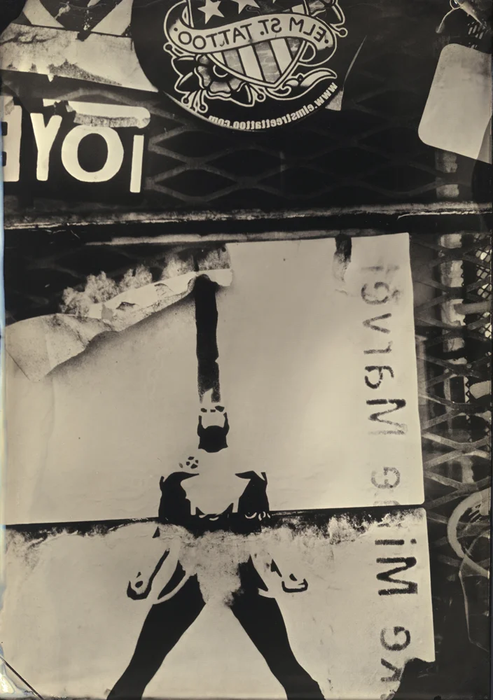 Make Mine Marvel: A Tintype View of Graffiti & Other Cultural Markers was born out of a searching of familiar symbols and shapes presented during many international travels. An accumulation of random iPhone images began an exploration into subversive and symbolic meanings of left-behind works of art - graffiti and slap tags. These could be locally sanctioned, but mainly, they were left behind to be found by unsuspecting viewers. The images presented were first photographed with my available and daily camera - the iPhone and reinterpreted into Wetplate images by rephotographing off of an iPad screen. This was intentional to blur the line between two historical processes that presented a democratic moment in the history of photography - mediums that brought accessibility of image-making to the masses. This melding of 19th & 21st century techniques is further blurred with the advent of slap tags and graffiti as new found artwork - a modern version of cave art.